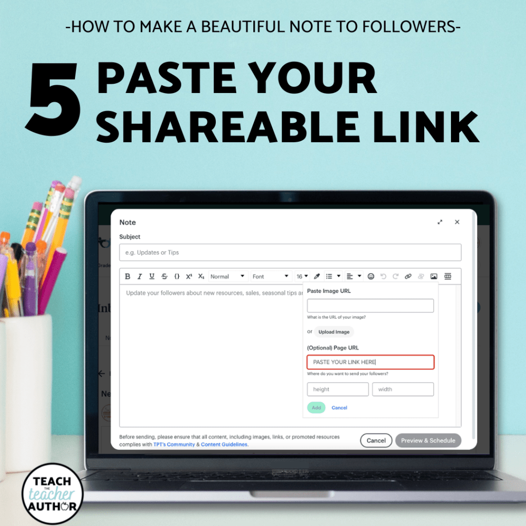 - Add the image to your Note to Followers in TPT’s editor. As you upload the image, paste the share link in the tool where it asks for a URL (image below).